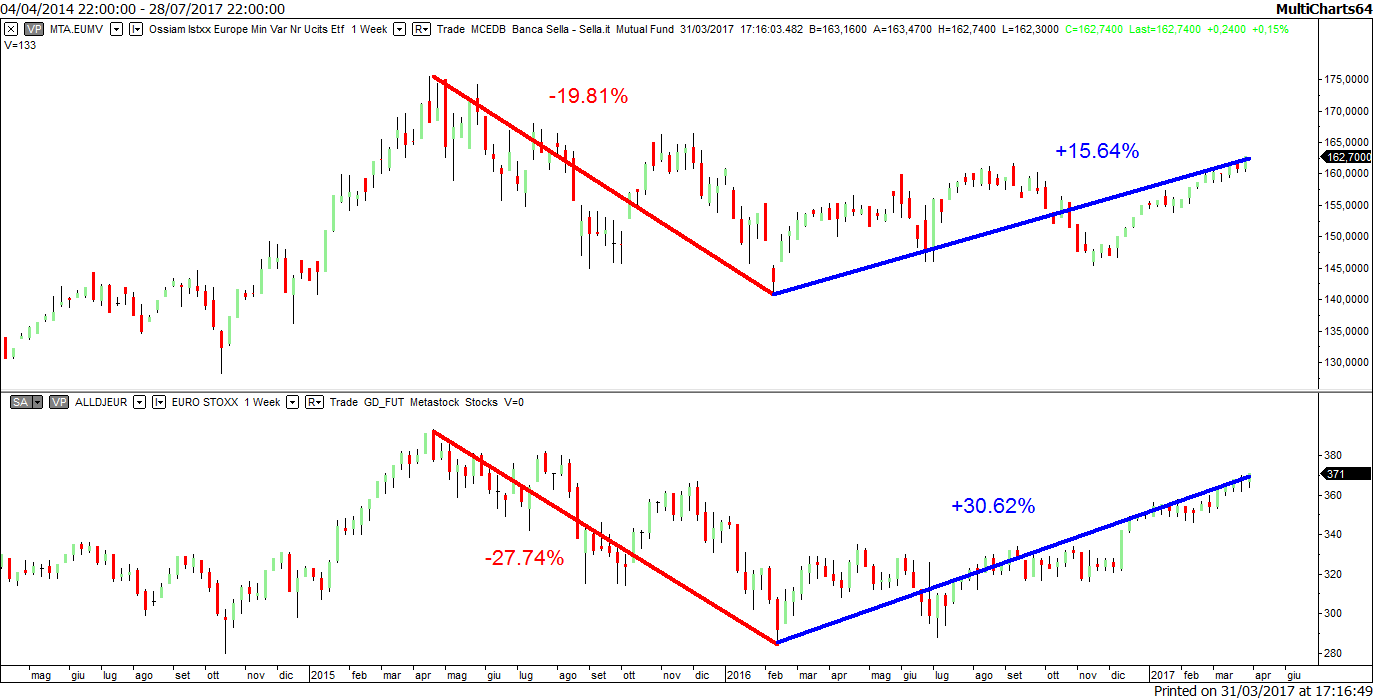 Nell'immagine sotto invece si vede il confronto in termini percentuali tra l'Eindice Stoxx 600 e l'ETF Ossiam essendo il più longevo: