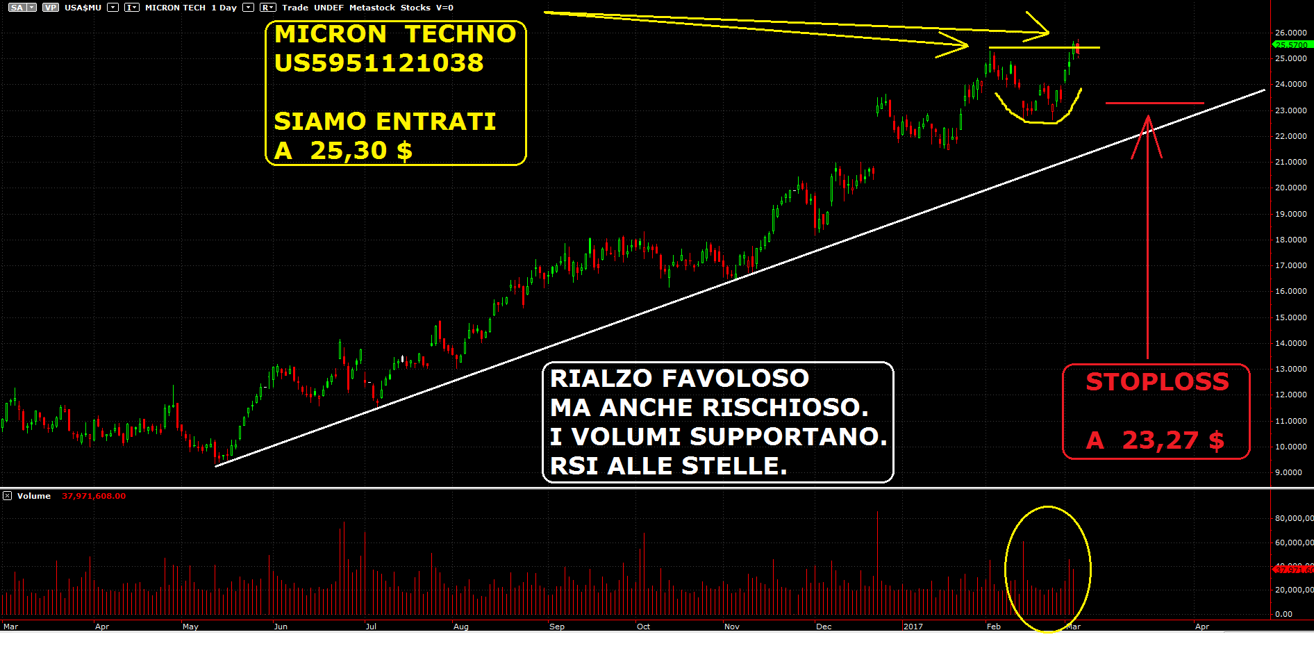 Per quanto riguarda il nostro Portafoglio azionario, da segnalare l’acquisto in mattinata del titolo italiano SAES GETTERS, autore di una performance molto alta e che tuttora fa segnare un + 6,10% e una scommessa su un titolo tecnologico USA, MICRON TECHNO, che da maggio 2016 ha visto il suo valore aumentare del 150% e proprio per questo un po’ rischioso, ma l’interesse ed i volumi sul titolo esistono, l’ipercomprato è stato scaricato ed ora è visibile una bella accumulazione……non resta che incrociare le dita.