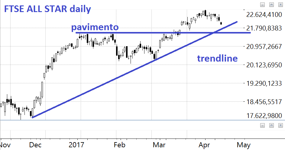 Tamburi di guerra all'orizzonte. Tra Nord Korea, manovra fiscale, elezioni francesi e spread BTP - Bund sopra 210 la situazione non è serena. Ma come sempre meglio vendere un minuto dopo che cambiare idea troppo presto. Quindi rimaniamo fermi in attesa degli eventi. Il trend è amico e se parte poi dura o bisogna presupporre che duri fino a prova contraria. Quale è la prova contraria ? Stabiliamolo subito: 1) abbiamo una trendline molto poco formata ma che comunque è una trendline che ci sorregge e siamo ancora lontani 2) abbiamo un pavimento che è il massimo relativo precedente che è ancora lontano. Quindi oggi una barra negativa non ci dovrebbe molto impensierire e forse se il trend riparte è una buy opportunity.