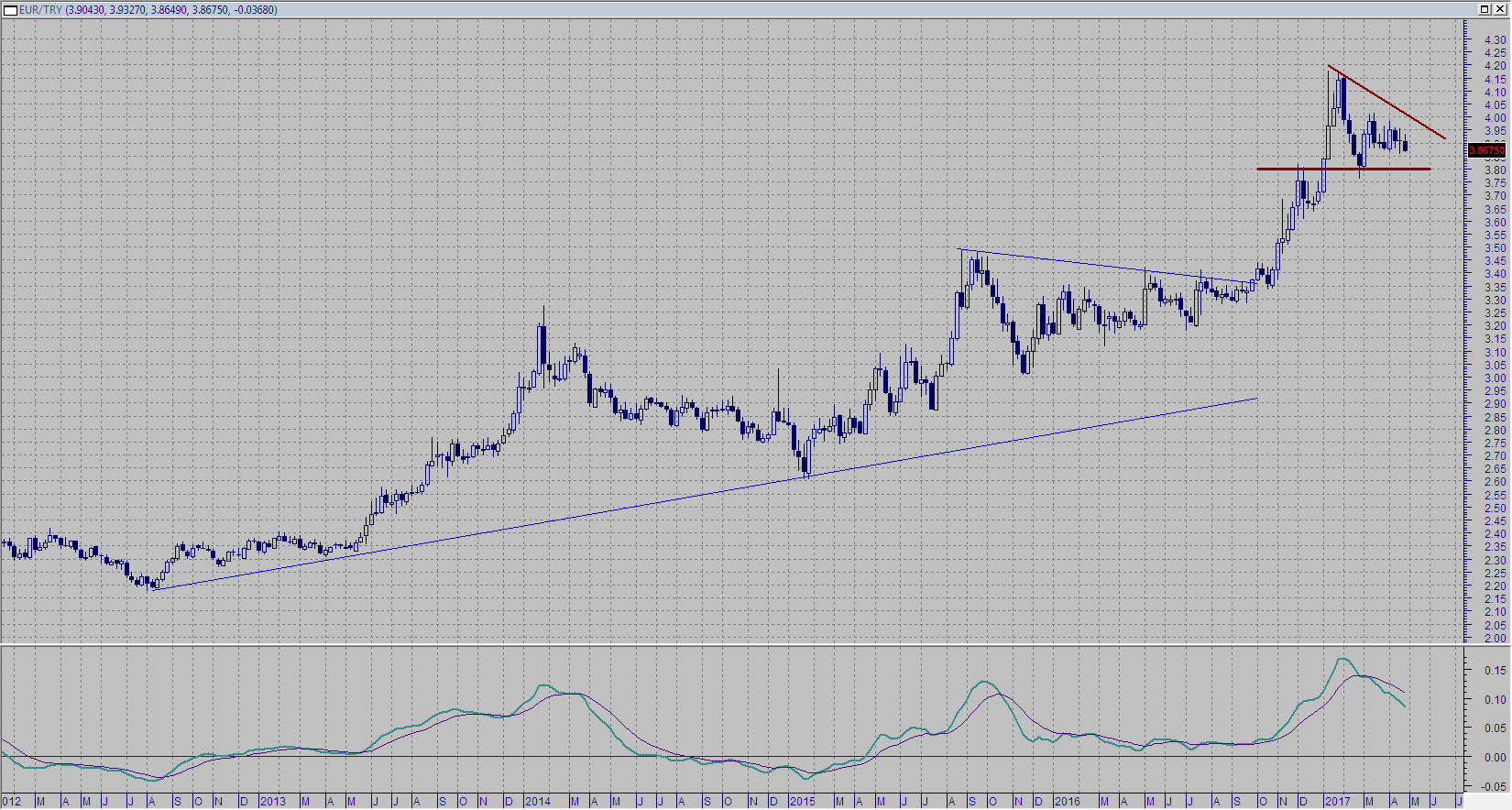 Con le debite precauzioni sì, sempre fermo restando le avvertenze di cui poco sopra. Il cambio EUR/TRY si trova oggi in una condizione che lascia (sotto il profilo grafico) margine di manovra seppur ristretto. Come si vede dal grafico sotto, dopo i massimi in area 4,15 una prima correzione ha testato il supporto in area 3,80 per poi rimbalzare e tornare in area 4,00. Ora siamo nuovamente in viaggio per un secondo test di 3,80 con un trend di breve favorevole alla valuta turca.