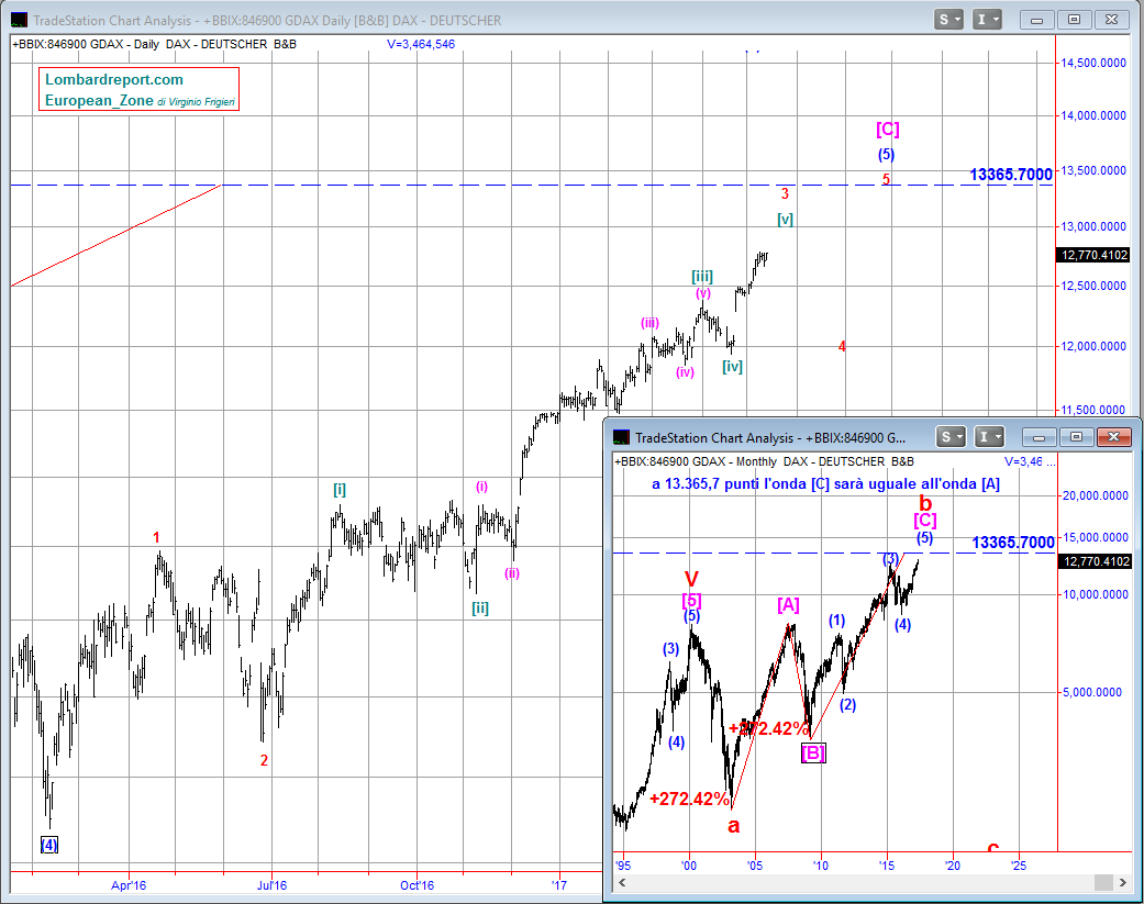 L'ultima volta che gli investitori hanno espresso alta fiducia nel mercato azionario tedesco è stato nel periodo tra novembre 2010 e luglio 2011, il periodo che precede il top di onda (1) nel riquadro in basso a destra del grafico sottostante. Subito dopo è arrivata puntuale l'onda (2) con una correzione al ribasso di quasi il 35%. Oggi il DAX sta portandosi ad un picco di più alto livello, ma quando termina l'onda (5) si concluderà una fase rialzista durata un decennio ed avrà inizio il più grande mercato orso di tutti i tempi. Se si considera che nella maggioranza dei casi le onde C tendono a terminare con la stessa lunghezza delle onde A non dovrebbe nemmeno mancare tanto tempo. Nel nostro caso trattandosi di un ABC di grado Primario in una abc di grado cycle che dura da 17 anni non possiamo ragionare in punti assoluti ma in percentuale: così l'onda [A] dal minimo di onda a (parlo sempre del riquadro piccolo in basso a destra) ha messo a segno una performance del 272,42% e l'onda [C] a partire dal minimo di onda [B] avrà messo a punto la stessa performance quando il DAX raggiungerà i 13.365,7 punti.