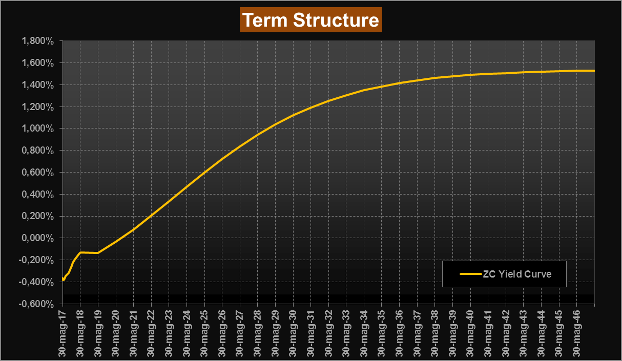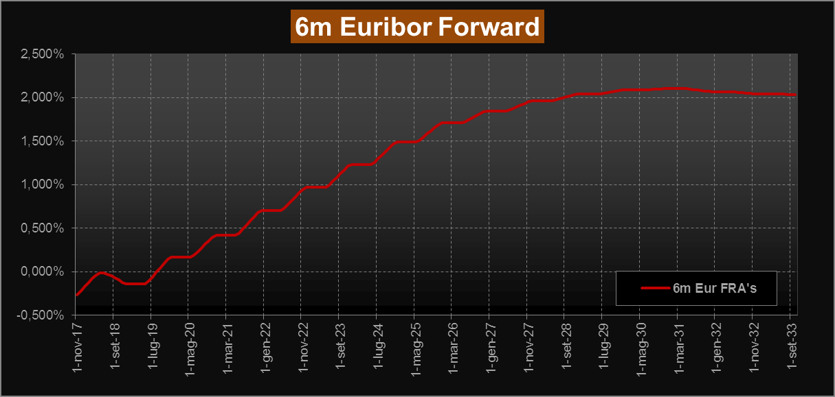 La ZC Yield Curve sembra quasi una fotocopia di quella presentata alcuni articoli fa, così come i forward su Euribor 6 mesi che con variazioni del tutto marginali continuano ad indicare area 2% per le scadenze medio-lunghe e incrementi costanti e progressivi sul tratto a breve e un ritorno in territorio positivo tra fine 2017 e inizio 2018.