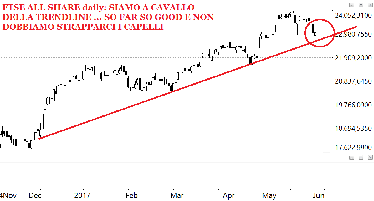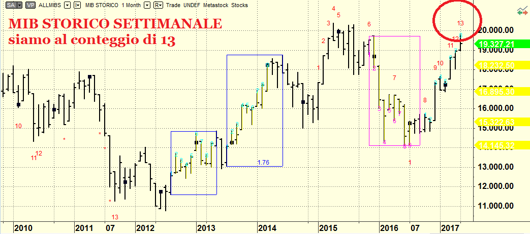Come disse un giorno un lettore storico di questo foglio: “I sequential bisogna vederli prima e non dopo anche se Tomasini non ci crede molto”. Eccovi accontentati. Allora siamo sul mensile sotto Sequential, perché abbiamo raggiunto la barra 13. Ma diciamoci apertamente che un Sequential ha valore e senso se esiste una tendenza, se sei nella parte alta di una congestione orizzontale che dura dal 2009 ad oggi … ha ben poco valore. Come ripetiamo su questo sito da una vita il Sequential è un indicatore ciclico: dopo la 13 barra si cambia registro e se il ciclo non viene rispettato e mantiene la direzione originaria abbiamo una accelerazione. Quindi questo mese di maggio ci sta sostanzialmente dicendo che siamo arrivati a fine corsa: la prossima corsa sarà violentemente al rialzo oppure una ricaduta bel baratro di questa maledetta congestione in cui ci dibattiamo da troppi anni. La mia personalissima opinione è che ci sarà l’accelerazione, quando ovviamente non so dirvi, ma da qui alla fine dell’anno sì. La ragione si chiama PIR, sempre loro, ormai lo hanno imparato tutti. Siamo stati noi i primi a scriverlo e ormai compare sulle pagine di tutti i giornali. Se guardate ormai tutti i titolini si muovono per effetto simpatia e ci sono titolini (come Fiera Milano ad esempio) che improvvisamente si risvegliano da torpori ormai secolari. E’ il segnale che ci sono soldi freschi che arrivano sul mercato e che qualcosa debbono pur comprare. E’ evidente che abbiamo davanti il generale estate, ma il PIR può sconfiggerlo con la forza dei suoi baiocchi. Sarà un interessante conflitto perché mai era capitata finora nella mia avventura professionale di vedere una forza stagionale come quella del “sell in may and go away” alle prese con un fattore straordinario come i PIR. Vinceranno i PIR di sicuro, ma la battaglia sarà appassionante.
