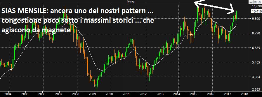 Incredibilmente un buy ufficiale. Non me lo aspettavo di questa stagione, che passa per essere più florida della media. Dopo Fincantieri che sta tutto sommato facendo la sua porca figura e Reno de Medici che ha finalmente segnato il punto di entrata con il massimo di oggi ecco che siamo costretti a piazzare un buy ufficiale su SIAS da comprare domani a 10.56 stop. Siamo costretti perché se hai una regola la devi seguire anche il 12 di luglio, spiace ma è così perché questo è un lavoro. Di Sias mi piace il fatto che abbiamo poco sopra un massimo storico e soprattutto abbiamo poco spazio che ci separa da quel massimo importante e quindi è facile prevedere che andremo a parare colà. Sias ha avuto un ottimo momentum e oggi ha ritracciato dandoci il punto per entrare minimizzando il rischio. Quindi andiamo, altrimenti che ci stiamo a fare ?