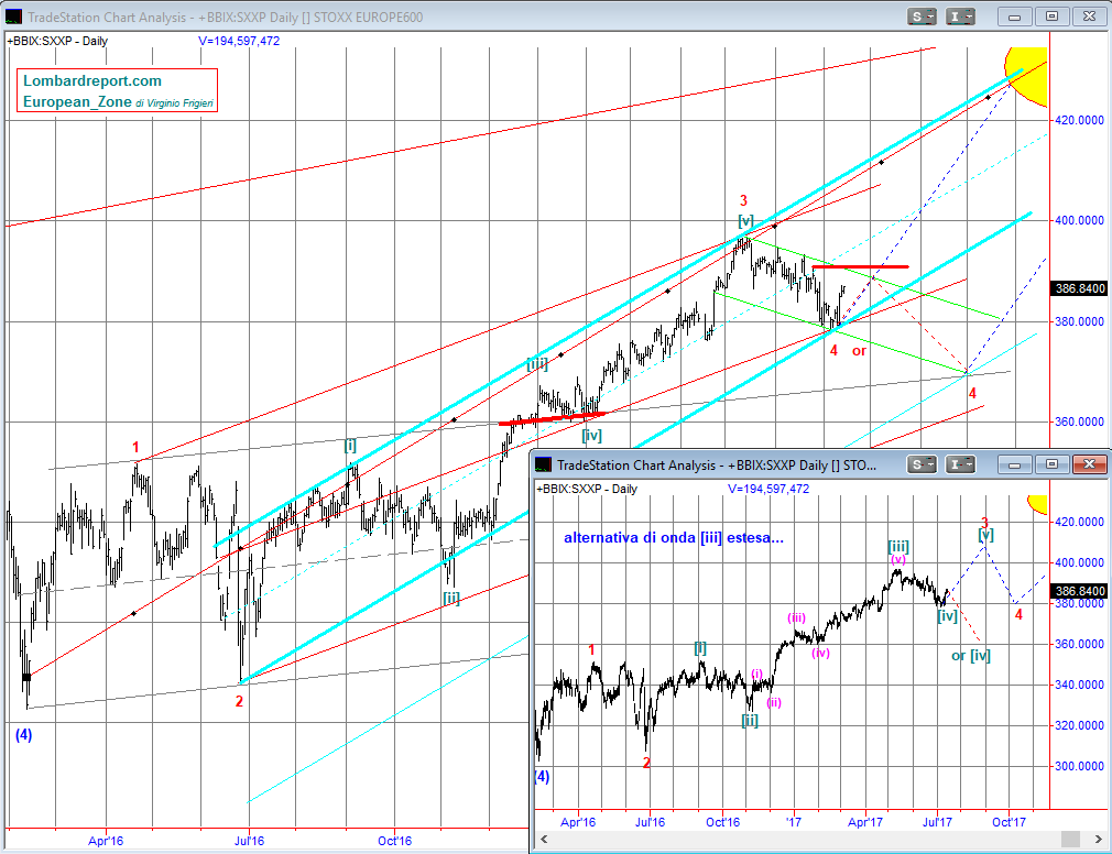 Nel grafico sottostante ho sviluppato il modello ipotizzato nel numero scorso e una variante che considera l'onda [iii] di grado minute come onda estesa. Nel primo caso, che reputo più probabile, è evidente che siamo in onda 4 di grado minor e l'unico dubbio è che potrebbe già essere terminata per cui il rialzo di questa settimana sarebbe già l'inizio di onda 5, oppure potrebbe essere un onda [b] in corso a cui seguirebbe una [c] che arriverebbe in prossimità della trendline superiore del canale di base (linee grigie). Se l'onda 4 è conclusa i prezzi andranno a sfondare il canale di decelerazione (linee verdi) e la linea orizzontale rossa (390,91) e l'onda 5 si svilupperà all'interno del terminating channel (linee azzurre) o a ridosso della trendline superiore sulla trendline mediana (tratteggio azzurro). Se l'onda 4 prosegue portandosi a ridosso della trendline grigia allora saremmo nella situazione ideale anche per la casistica proposta nel riquadro piccolo. Quale che sia lo sviluppo corretto, il risultato finale non cambierà di molto. l'onda minor 5 dovrebbe terminare tra i 420 e i 440 punti.