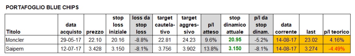 Molto bene Moncler che fa breakout e ritocca anche se di poco il precedente massimo di periodo. Lo stop dinamico si alza a 20.95. Supporto di breve a 22.16.