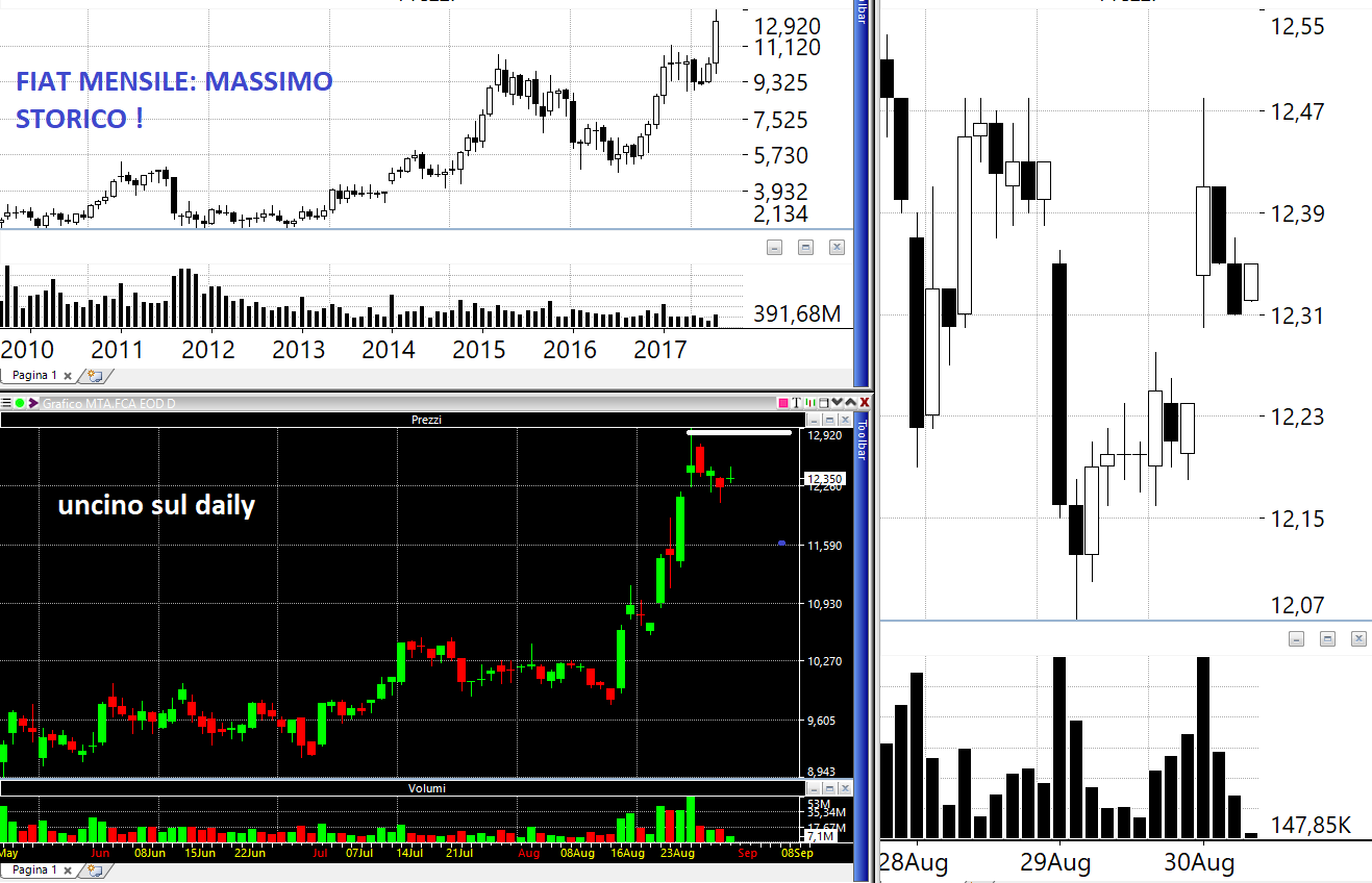 Un lettore mi ha chiesto se un giorno compreremo le azioni FCA visto che sono sui massimi storici. Il lettore ha ragione sotto diversi punti di vista: il primo è che FCA è un titolo molto autocorrelato e quindi significa che è facile guadagnare, i breakout sono tipicamente buoni. Il secondo è che un massimo storico è un massimo storico e c'è poco da discutere. Esiste una sola contro-indicazione: è un titolo liquido, molto liquido, troppo liquido. Quindi seguiamo la situazione passo dopo passo, ci piace e ci piace molto, su questo punto diamo ragione al lettore, aspettiamo domani e vediamo come chiude oggi.