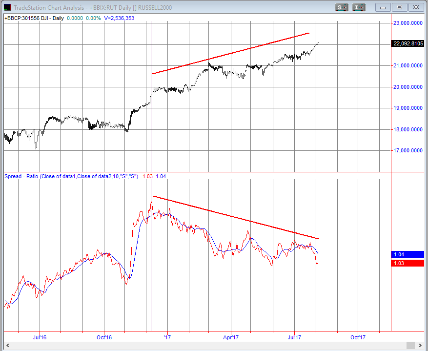 E per finire un altro elemento che deve preoccupare in contrasto col trend ascendente del Dow Jones è il rapporto tra il Russell 2000 (small cap's ad alto beta) e il Russell 1000 (large cap's). Come si vede nel grafico sotto questo rapporto è in calo continuo e ininterrotto ormai da dicembre dello scorso anno. Quando l'euforia speculativa svanisce gli investitori tendono a mollare i titoli a bassa capitalizzazione preferendo rifugiarsi nei titoli a larga capitalizzazione e quando succede questo l'indice Russell 2000 inizia a sottoperformare il Russell 1000 per cui se si plotta l'indicatore Spread-Ratio si ottiene appunto l'andamento calante ben evidente sul grafico. Come livelli di attenzione terremo monitorato quota 2457 su S&P500, il cui cedimento darebbe una forte spinta alle probabilità che onda 4 sia in corso e 6.313 sul Nasdaq Composite.