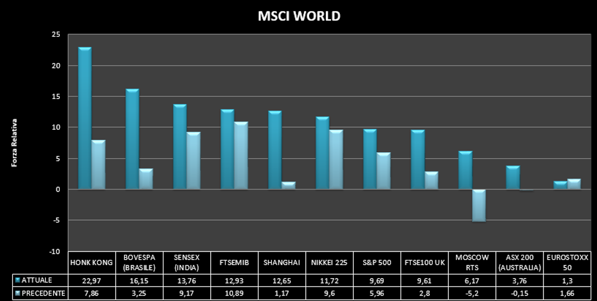Dal punto di vista della forza relatva il FTSEMIB spicca come uno dei paesi migliori; è fisiologicamente normale visto che siamo stati per anni nel dimenticatoio e la Borsa è un sistema di vasi comunicanti dove le masse di denaro si spostano a seconda della convenienza. Vedremo nelle prossime settimane se ci sarà un opportuno punto di ingresso.