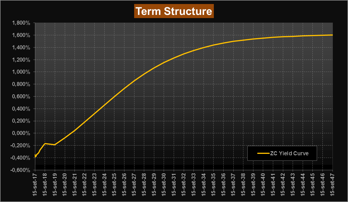 Come di consueto partiamo dalla ZC-Yield Curve che si è mossa poco dall’ultima rilevazione, a parte un ulteriore leggero irripidimento nel tratto a breve e un allargamento dei rendimenti sul tratto a lunga di circa 10 bps. I rendimenti a lunga lambiscono quindi area 1,60% circa, e la parte a breve continua a scontare – anche dopo le ultime parole di Draghi della settimana scorsa – aspettative per una politica monetaria BCE piuttosto accomodante forse anche nel 2018. Stando alle dichiarazioni del Governatore centrale, sarà eventualmente ottobre il mese in cui la BCE prenderà decisioni in merito al Tapering, e cosa di non poco conto ha puntato l’attenzione anche sul cambio EUR/USD, valutato evidentemente come potenziale elemento di disturbo sulla politica monetaria in caso di allunghi “troppo” esuberanti contro la valuta USA.