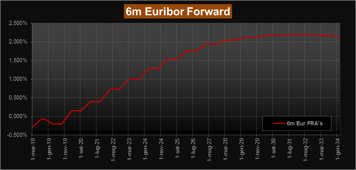 Si adeguano a questo anche i forward su Euribor 6 mesi che, oltre a proseguire nell’indicare attese per un atteggiamento compiacente della BCE, allargano leggermente e si portano sul tratto a lunga in area 2,20% circa 10 bps in più rispetto alla scorsa rilevazione.
