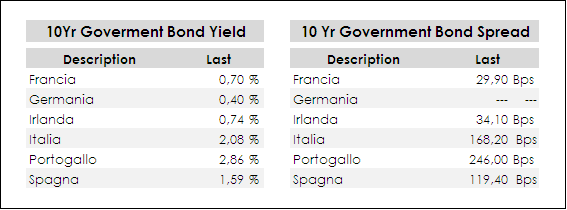 Maggior stabilità a livello di spread, con i periferici (Italia, Spagna e Portogallo) che allargano di una manciata di punti base, ma non modificano nella sostanza i rendimenti dei benchmark decennali, di fatto stabili rispetto alla scorsa rilevazione. Rimane pertanto valido il suggerimento, per chi fosse investito su debito portoghese, di liquidare le posizioni se lo spread POR/GER dovesse portarsi sopra i 280/290 bps.