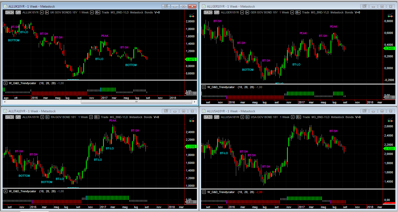 Osservando – a livello di analisi integrata – le curve dei rendimenti dei benchmark decennali dei principali mercati, permane il movimento in coerenza con quanto indicato sia sul tratto a medio della ZC-Yield Curve sia dai forward su Euribor 6 mesi. Infatti i rendimenti dei principali governativi a 10 anni stanno confermando il trend al ribasso, con una lieve riduzione dei rendimenti rispetto alla precedente rilevazione. Per cui possiamo attenderci ancora prezzi dei bond stabili o in lieve salita. Attenzione però al fatto che i movimenti attuali sono da inquadrare come correzioni (seppur in atto da mesi) di un trend principale al rialzo (ergo prezzi dei bond in discesa e rendimenti in salita), come si bene dai minimi registrati intorno a luglio del 2016.