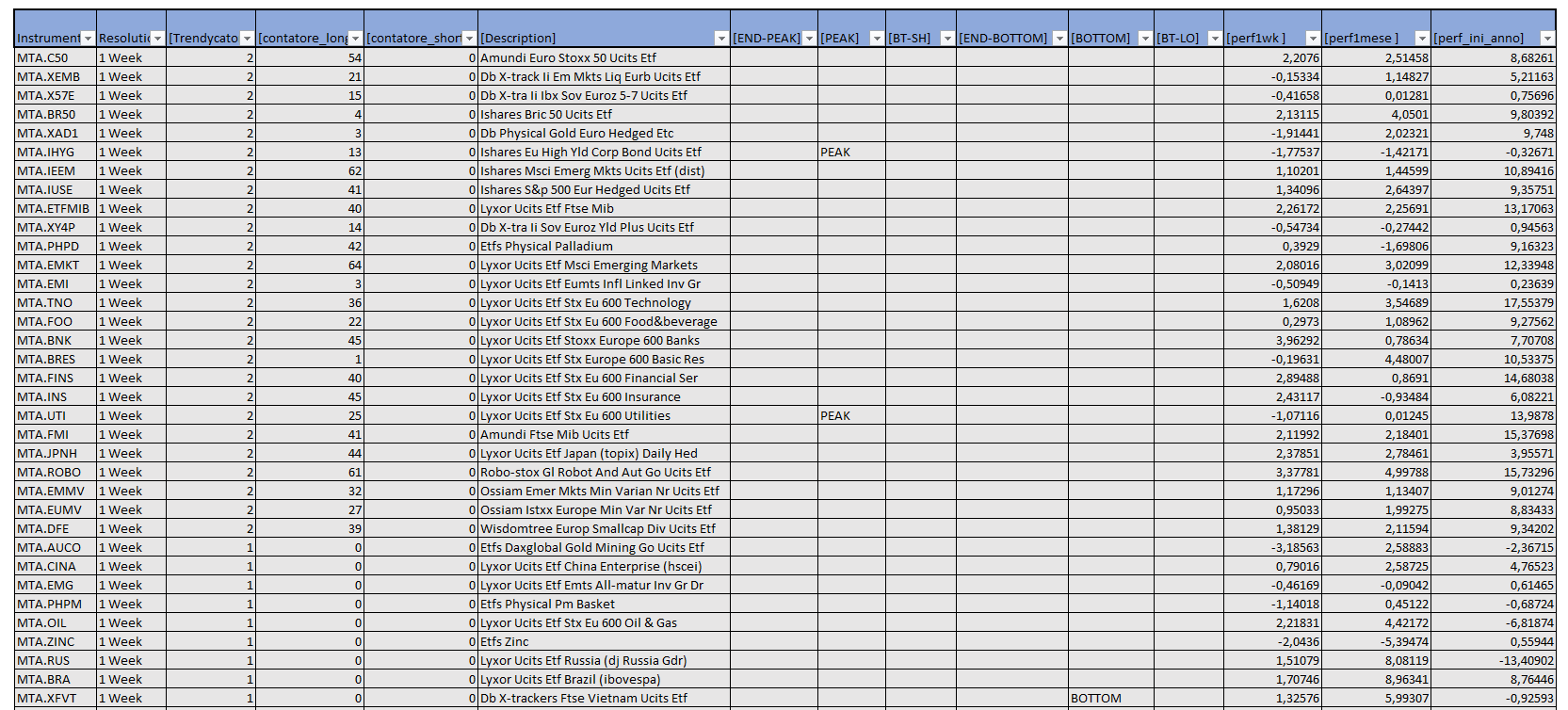 Il ranking si presenta come un foglio Excel che l’utente può decidere di ordinare come vuole: ad esempio se ordino per Trendicator andando a ricercare i titoli che sono a 2, si possono individuare subito i trend nascenti grazie al “contatore long” il quale mi dice da quante settimane perdura lo stato 2 nell’indicatore.