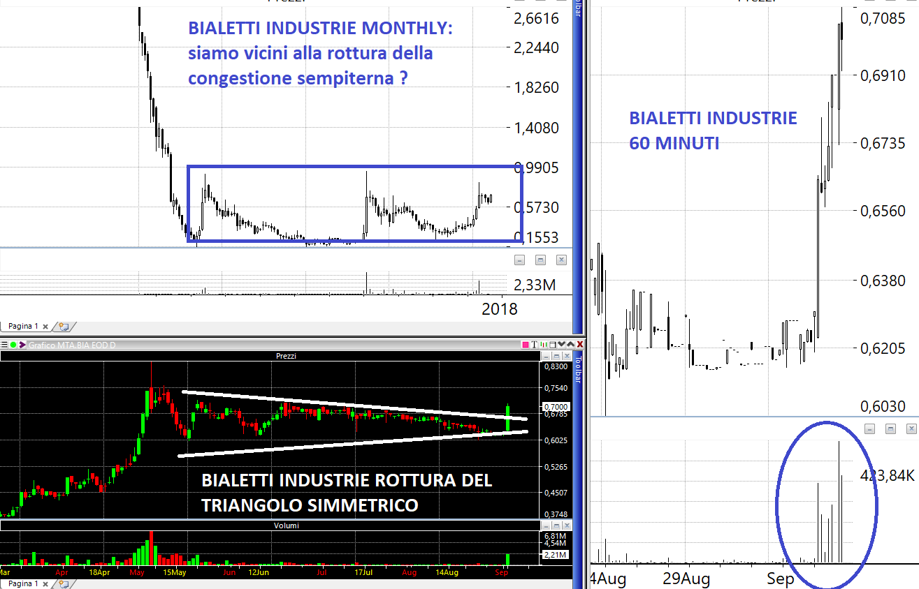 BIALETTI INDUSTRIE: è una azione che oltre a seppellire il fondatore in una caffettiera ha numeri più umani a livello di analisi fondamentale ma sempre ottimi: ROE dal 2014 al 2016 del 71,87%, del 30,53%, del 18,99%. L’attuale quotazione rispetto al fair price è sopra del 27% ma non importa molto quando si nota che la forza relativa a livello di momentum per la prima volta ha stracciato quella del nostro indice Ftse All Share e diciamocela francamente si tratta di due gatte morte (almeno fino questo punto e solo per quanto riguarda l’analisi tecnica visto che entrambe le serie storiche giacciono su dei minimi pluriannuali). Il segnale del superamento in termini di momentum di Bialetti sull’indice Ftse All Share è qualcosa che non si ferma qui.