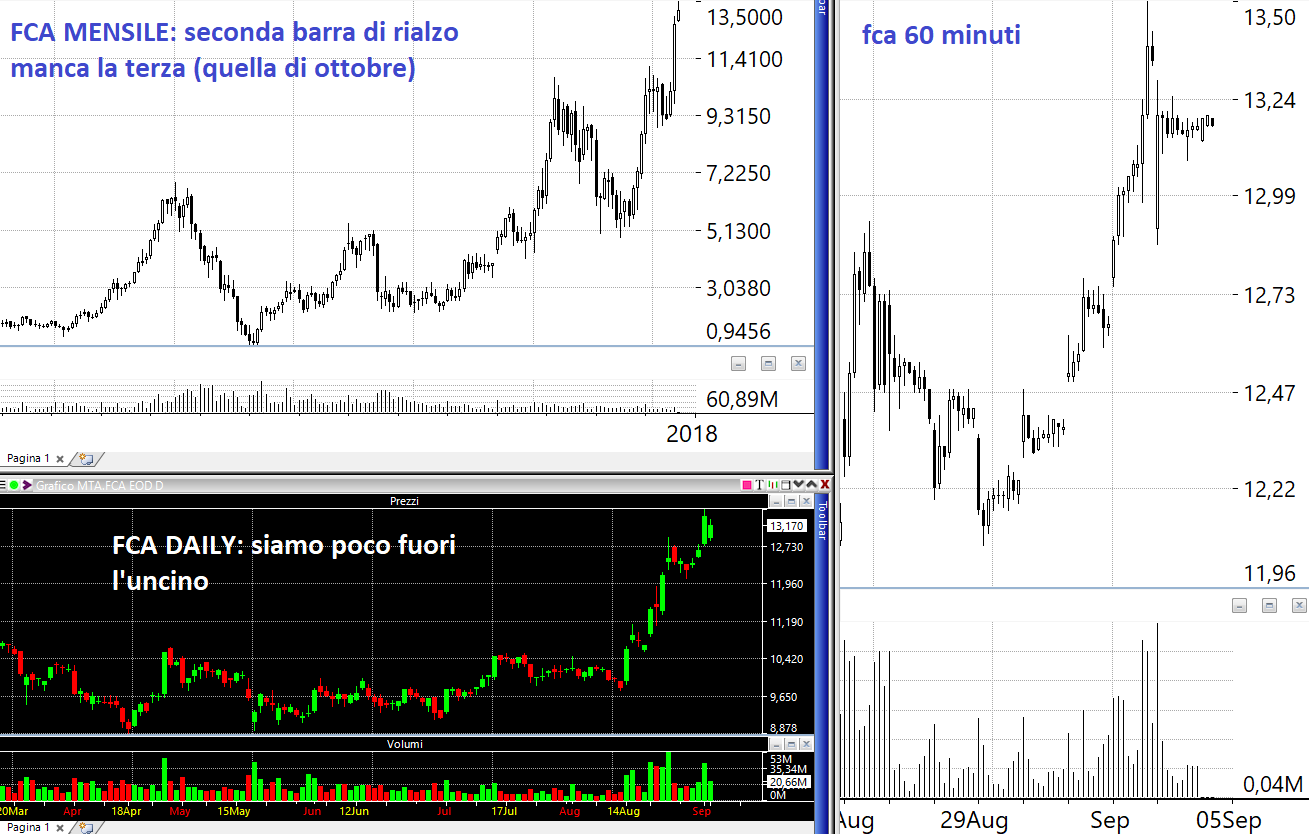 FCA: se guardate questo titolo sul mensile noterete come sia sui massimi assoluti e ci sia già una barra mensile formata e ora siamo nella seconda mensile in formazione (settembre). La regola del 3 vale su ogni time frame ovvero un trend al rialzo sui massimi storici non può durare una sola barra e quindi ci aspettiamo un settembre e un ottobre di fuoco su questo titolo che rimane un buy grande come una casa.