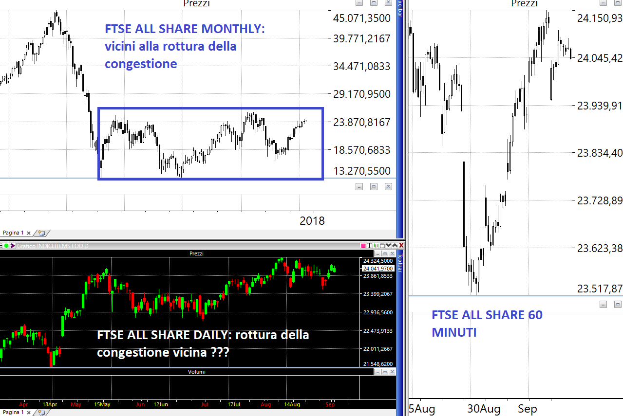 Bisogna che ricordiamo che il rialzo oltre quota 25.000 del Ftse All Share inizierà quando l’ultimo compratore avrà comprato (traduzione: dopo che la smart money si sarà posizionata sui titoli migliori e avrà ultimato gli acquisti) e quindi questa finta congestione è ormai possibile definirla accumulazione in vista dell’esplosione al rialzo che avverrà salvo incidenti di percorso nel periodo autunnale: