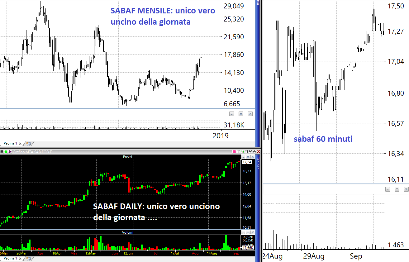SABAF: non è una azione della eletta schiera ma nemmeno appartiene al girone dell’inferno: il suo ROE dal 2014 al 2016 è stato rispettivamente di +7,53%, +8,10%, +8,10%. A livello di prospettive gode delle attese di ripresa del settore immobiliare. Il fair price calcolato con DCF rispecchia il prezzo di mercato ma il momentum è in accelerazione rispetto all’indice di mercato azionario italiano. Non è un titolo che abbiamo una capitalizzazione da meritare un buy (se lo dessimo lo ribalteremmo) ma sicuramente questo è il titolo che oggi consiglieremmo di acquistare perché sia il daily che il monthly sono veramente appetitosi: sul monthly uncino in corso, uncino anche sui daily ma soprattutto volumi monstre sul mensile.