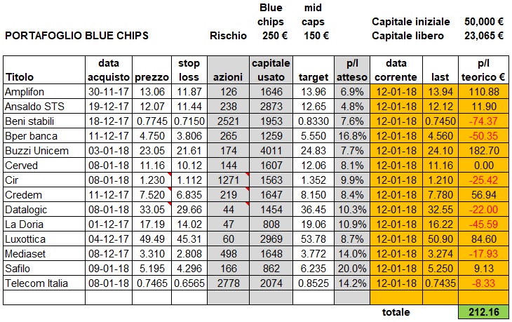 Facciamo il punto sul portafoglio prima di vedere il ricco menu per la settimana entrante. Questa la situazione alla chiusura di venerdì 12 gennaio: