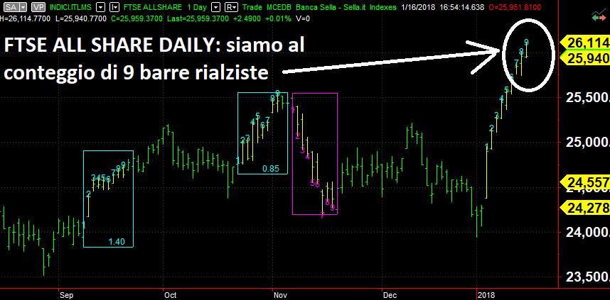 E’ come stare su una giostra a 80 anni con il nipotino: aiuto fatemi scendere ! Per chi proviene non dalla veneranda età di 80 anni ma da un prolungato periodo di congestione come quello che abbiamo vissuto dal 2009 ad oggi quello che sta succedendo ora sui mercato è inconcepibile. Ma come, il mercato è salito al rialzo ? Oddio dovrà scendere, che paura, che vertigini ! Diciamo che se fai previsioni di Borsa per mestiere come il sottoscritto, a parte qualche caso luminoso, nell’industria finanziaria appartieni alla schiera dei falliti, soprattutto se hai la mia età. Quelli buoni sono andati a fare gli asset managers tanto tempo fa e guadagnano 10 volte di più. Quindi a fare previsioni di Borsa ci rimangono o i ragazzini (che ancora debbono diventare asset managers) o quelli come me. E i ragazzini sono la maggior parte e gran parte di loro ha iniziato il business dopo il 2006 e quindi non ha mai visto un mercato al rialzo fuori controllo. Per questo gran parte dei commentatori oggi sul mercato stenta a credere che quello che sta succedendo ora avrà un effetto di lungo termine sulla nostra Borsa e sull’industria finanziaria. Provate a trovare qualcuno che si chieda cosa succede secondo un banale manuale di analisi tecnica se fosse vero che l’indice Ftse All Share è rotto a quota 25.548 e quale è l’obiettivo successivo. Qual è la risposta ? Semplice: quota 40.000 e passa ad essere minimalisti. Questa è la posta in gioco di quanto sta succedendo sul mercato, ma ripeto nessuno l’ha mai visto prima e quindi tutti si chiedono quando il mercato tornerà dove era prima. Nemmeno l’investitore ha l’adrenalina addosso perché ormai non si ricorda più un mercato al rialzo. E io stesso, che appartengo secondo il modo di vedere dell’industria finanziaria alla schiera dei falliti, vi confesso che non mi ero più abituato ad un mercato al rialzo e faccio fatica a raccapezzarmi in un mercato in cui tutto va al rialzo. Questa potrebbe essere la spiegazione della mancanza di respiro del mercato: i market player debbono ancora realizzare che abbiamo chiuso un’epoca e se ne sta aprendo un'altra e ci vorrà il prossimo ritracciamento e quindi il prossimo breakout dei nuovi massimi per comunicare al mercato che davvero il mondo è cambiato, sempre ammesso che tutto che sto scrivendo sia vero. E del resto il capitalismo è gran parte psicologia e quindi questo discorso ci sta tutto. Oggi è la nona barra del setup di Demark e domani al massimo si scende. Posto di seguito il grafico dove potete vedere il conteggio ribassista di 8 barre, ci manca la nona e poi il Set Up è completo. Come i lettori più esperti sanno il Set Up è un conteggio di 9 barre rialziste con la chiusura superiore alla chiusura di 4 barre prima. Esaurito il Setup rialzista c'è un breve ritracciamento e quindi parte il CountDown con 13 barre rialziste. Diciamo che la lettura di Demark del mercato si sposa assolutamente alla perfezione con la situazione attuale. Se notate raramente un SetUp sbaglia il colpo e i due SetUp precedenti (indicati da dei box gialli se rialzisti o viola se ribassisti) sono tutto sommato andati a buon segno.