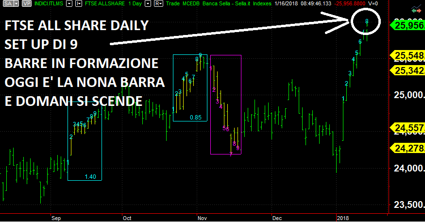 Oggi è la nona barra del setup di Demark e domani al massimo si scende. Posto di seguito il grafico dove potete vedere il conteggio ribassista di 8 barre, ci manca la nona e poi il Set Up è completo. Come i lettori più esperti sanno il Set Up è un conteggio di 9 barre rialziste con la chiusura superiore alla chiusura di 4 barre prima. Esaurito il Setup rialzista c'è un breve ritracciamento e quindi parte il CountDown con 13 barre rialziste. Diciamo che la lettura di Demark del mercato si sposa assolutamente alla perfezione con la situazione attuale. Dobbiamo solo vedere se sarà vero o no, ma se notate raramente un SetUp sbaglia il colpo e i due SetUp precedenti (indicati da dei box gialli se rialzisti o viola se ribassisti) sono tutto sommato andati a buon segno.