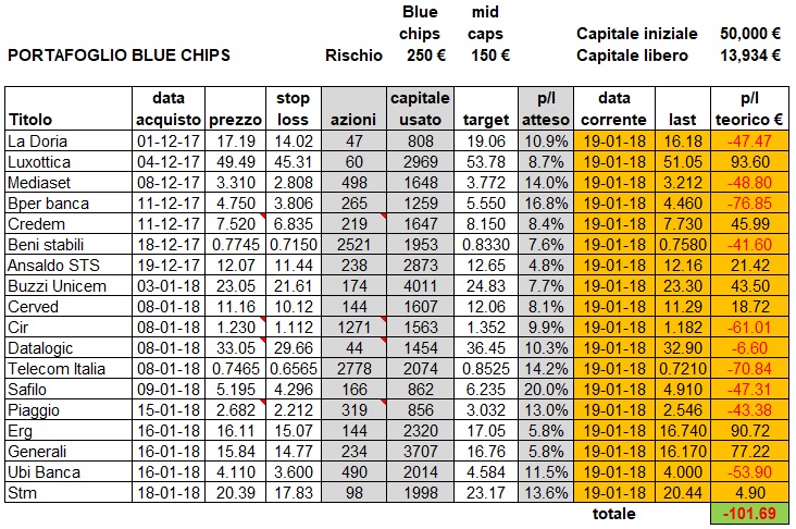 Quattro posizioni nuove entrate la scorsa settimana (vedi portafoglio qui sotto). Bene Erg e Generali fino a venerdì. Domani chissà. portafoglio aggiornato alla chiusura di venerdì 19 gennaio. La quantità di azioni comprate su Piaggio è stata adattata all'apertura in gap per mantenere fisso il rischio.