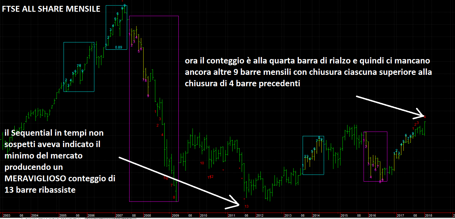 Facciamo un passo in avanti, mostriamo un grafico del Ftse All Share che nessuno mostra mai con il Sequential di Demark, time frame mensile: notate che ad ogni box con bordi lilla o azzurri (SetUp) corrisponde una reazione (piccola) nella direzione opposta mentre ad ogni conteggio di 13 (ne esiste solo uno, segnalato a suo tempo sul nostro sito, nel settembre 2011 che è il minimo assoluto degli ultimi quasi 20 anni) esiste un movimento (grande) in direzione opposta (de facto il Sequential ha indovinato il minimo del mercato). Ora so che quasi nessuno dei miei lettori si fida di questa analisi benché io da circa 20 anni li tenga costantemente aggiornati sui diversi conteggi (e costantemente i lettori perdono un pezzo importante di informazione ma capisco che la fede nel Sequential è un dono e non una pratica corrente):