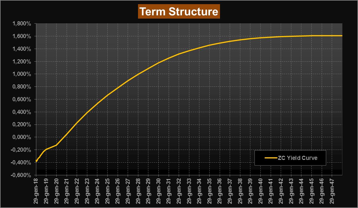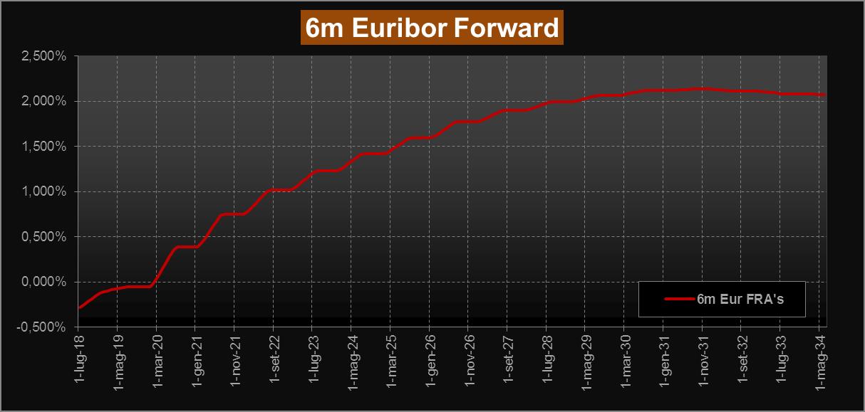 La nostra consueta lettura del mercato obbligazionario attraverso la ZC-Yield Curve, ci mostra questa settimana una curva con rendimenti impliciti sostanzialmente stabili rispetto alla scorsa rilevazione. Sul tratto a lunga rimaniamo sopra area 1,50% per le scadenze dal 2037, e area 1,40% è stabile dalle scadenze 2034; sulla scadenza a 10 anni sempre in area 1% come nella precedente rilevazione. stabile anche la parte a breve che conferma la conformazione più ripida mantenendo la quasi totale linearità di salita su tutto il tratto, come osservato nella scorsa rilevazione. Conseguentemente stabili anche i forward su Euribor 6 mesi, sia sul tratto a lunga che rimane stabile oltre area 2,00% sia sulla parte a breve che continua ad indicare l’allontanamento progressivo dai tassi negativi puntando allo zero.