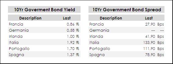 Compatibili con i movimenti della ZC-Yield Curve anche gli aggiustamenti dei rendimenti dei benchmark governativi decennali “core”, mentre sui rendimenti e gli spread dei periferici si evidenziano differenze, dovute ad una maggior forza dei periferici che ha portato a riduzioni in alcuni casi significative. Il decennale tedesco rimane quindi a 0,58% di rendimento, seguito dall’Irlanda sempre in area 1% e dalla Francia a 0,86%; traggono invece buon beneficio Italia, Portogallo e soprattutto Spagna che sui dieci anni rendono rispettivamente l’1,92%, l’1,70% e l’1,37% con spread a 134 bps, 112 bps e 79 bps rispettivamente.