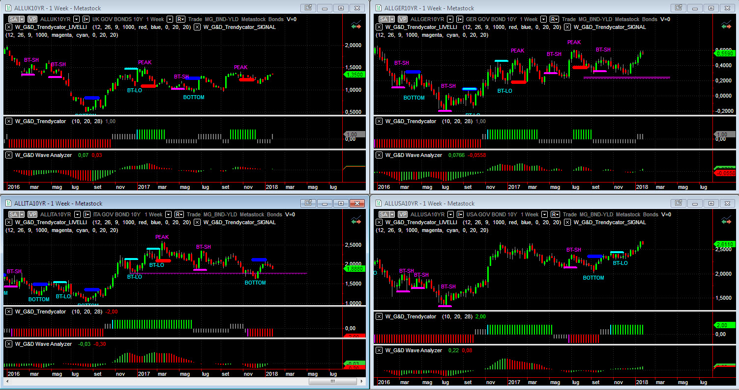 Osservando – a livello di analisi integrata – le curve dei rendimenti dei benchmark decennali dei principali mercati, notiamo come la situazione non sia molto diversa da quanto già analizzato nelle scorse settimane, su tutte le principali aree analizzate. L’area UK prosegue a mostrare il modello Trendycator sempre in area neutra con spinta moderata dei rendimenti verso area 1,40%; l’area USA ha Trendycator verde ormai da quattordici settimane consecutiva ed ha allungato con decisione sopra area 2,50% di rendimento; stabile il rendimento del Bund che dopo il rimbalzo deciso della scorsa settimana consolida su quei livelli con Trendycator neutrale/moderate long. Infine, il nostro Btp che abbandona area 2% di rendimento e si riporta verso il “supporto” tra area 1,75% - 1,70% con l’evidenza del potenziale BOTTOM che per ora stenta ad essere confermato.