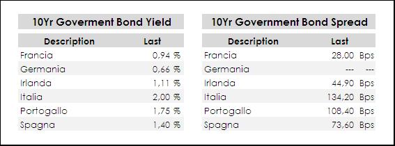 Compatibili con i movimenti della ZC-Yield Curve anche l’allineamento dei rendimenti dei benchmark governativi decennali, con alcuni spread che invece restringono, ma solo per una questione puramente matematica, e cioè il Bund ha corretto maggiormente rispetto agli altri governativi. Il decennale tedesco “vola” quindi a 0,67% di rendimento, seguito dalla Francia ora a 0,95% e dall’Irlanda ora a 1,12%; risalgono leggermente anche i rendimenti dei periferici – beneficiati la scorsa settimana da un momentum molto più favorevole rispetto al Bund – e così il nostro Btp torna al 2% di rendimento, il Portogallo a 1,74% e la Spagna a 1,40%. Sul fronte spread, sostanzialmente stabile l’Italia, mentre migliorano sensibilmente la Spagna e il Portogallo, rispettivamente a 73 bps e 108 bps.