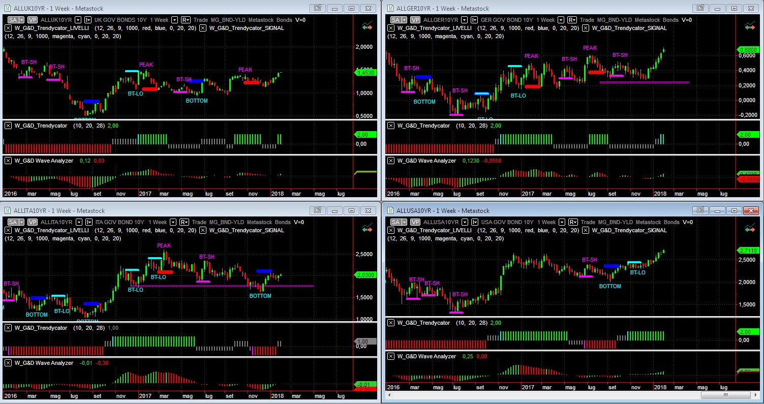 Osservando – a livello di analisi integrata – le curve dei rendimenti dei benchmark decennali dei principali mercati, notiamo che l’ipotesi n.2 (mercato obbligazionario con rendimenti in lieve ma costante rialzo) prende sempre più piede e diventa sempre più verosimile. Il modello Trendycator è passato a LONG sia sull’area UK sia sull’area BUND, confermando nei fatti quanto già indicato la scorsa settimana. L’area UK supera con decisione area 1,40% portandosi a 1,45%; il rendimento del Bund mette a segno un filotto di barre positive e supera di slancio area 0,60% di rendimento, ed è un evento, poiché tali rendimenti non si vedevano da gennaio del 2016. Il nostro Btp ritorna in area 2% di rendimento e il Trendycator abbandona la zona rossa per portarsi in zona neutrale, cosa che lascia ben presagire per la conferma del potenziale BOTTOM realizzato a fine 2017. Infine, l’area USA che ormai è ben avviata – come da tempo abbiamo già avuto modo di considerare – e con i rendimenti che arrivando in area 2,70% rappresentano un altro evento poiché è dal 2014 che i T-Bond non rendevano così “tanto”.