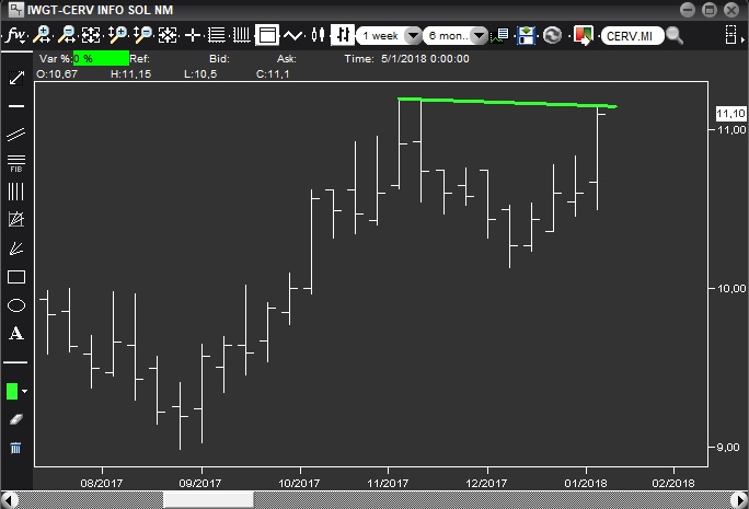 Buy stop 11.16, 144 azioni, stop loss 10.12, target 12.06