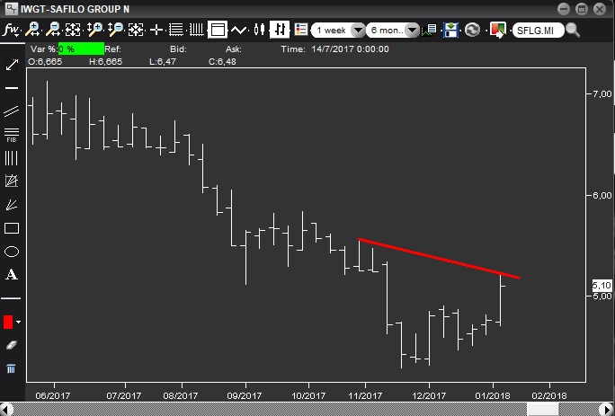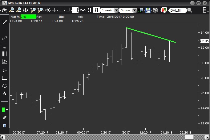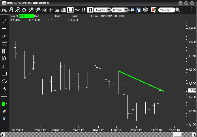 Situazione molto diversa da quella di Cerved, e comunque interessante: si è appoggiata ad un supporto importantissimo di medio, 1.118, per poi rimbalzare e recuperare in chiusura di settimana un ex-supporto a sua volta significativo perso otto settimane fa, 1.21. Da seguire assolutamente in caso di breakout.