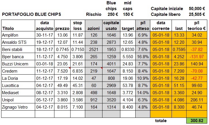 Il saldo complessivo delle operazioni chiuse alla data del 5 gennaio 2018 è di -847.11€, mentre il saldo temporaneo delle operazioni aperte è pari a +300.62€. Speriamo che le operazioni in corso vadano ai rispettivi target. Non convincono affatto La Doria e Beni stabili, ma anche qui rispettiamo la strategia e rimaniamo in attesa degli eventi.