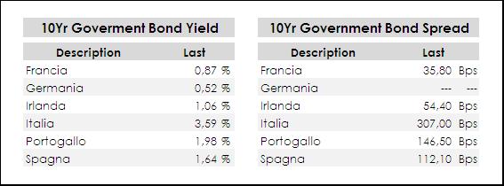Naturalmente movimentati gli spread, vista l’aria che tira in Europa, anche se i rendimenti dei benchmark decennali (a parte l’Italia…) non si sono poi mossi più di tanto. Il decennale tedesco si conferma oltre area 0,50% di rendimento (0,51% attuale contro 0,54% della scorsa rilevazione), la Francia va allo 0,87% e l’Irlanda si porta a 1,06%. Per ciò che concerne i periferici, il nostro Btp vola al 3,59% di rendimento, il Portogallo va a 1,98% e la Spagna va all’1,64%. A livello di spread Vs Bund, riprende l’altalena dell’Italia e quindi abbiamo Portogallo, Spagna e Italia rispettivamente a 146 bps, 112 bps e 307 bps.