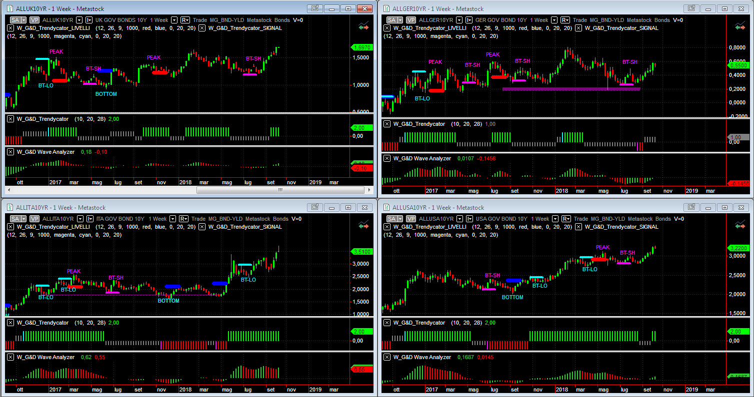 Osservando – a livello di analisi integrata – le curve dei rendimenti dei benchmark decennali dei principali mercati la tendenza di medio termine è confermata con Trendycator che si conferma LONG sull’area UK e si mantiene NEUTRAL sull’area BUND. L’area UK sale e si porta poco sotto area 1,70% di rendimento, mentre il decennale tedesco galleggia stabilmente oltre area 0,50%. Nuovamente in salita il rendimento del nostro Btp che realizza nuovi massimi relativi al 3,50% con l’impostazione di Trendycator imperterrita stabilmente su LONG (verde). Riprende anche la salita per l’area USA che segna nuovi massimi relativi e si assesta sopra il 3,20% di rendimento con Trendycator che conferma la conformazione LONG.