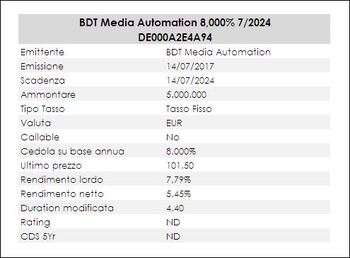Il bond HY che analizziamo oggi è un titolo emesso da BDT Media Automation Gmbh, società tedesca che progetta e produce soluzioni per la gestione dei dati e opera ovviamente in Germania ma anche a livello internazionale. L’azienda opera attraverso i segmenti di business di Storage Automation, Print Media Handling e Technical Services; pertanto offre prodotti per l'automazione dello storage, come i sistemi di archiviazione su nastro e su disco, protezione dei dati e conservazione a lungo termine dei dati digitali. Inoltre offre soluzioni di sistema per applicazioni di gestione dei media e tecnologia di automazione, attrezzature di finitura per stampanti laser, inkjet e digitali. Non di meno, innova, mantiene e ripara i dispositivi di archiviazione dati come le librerie nastro e i caricatori automatic. BDT Media Automation Gmbh è stata fondata nel 1967 ed è una controllata di BDT AG.
