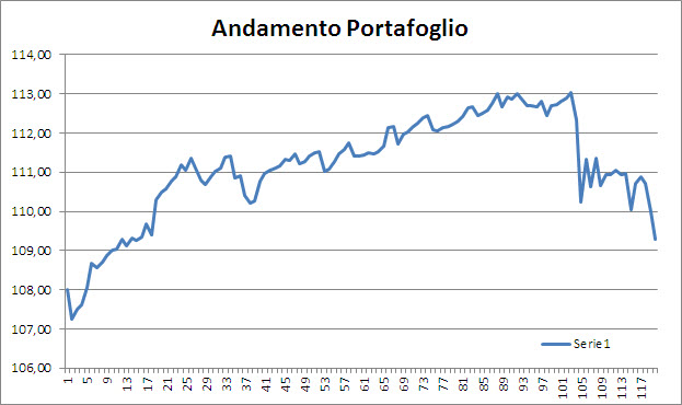 Aggiorniamo quindi il nostro portafoglio, ai prezzi correnti di mercato e con l’inserimento dei due fondi di cui sopra. Il nostro NAV vale oggi 109,30 e potrebbe aver toccato il punto minimo di questo folle e assurdo ritracciamento comandato da logiche di lobby e caste piuttosto che da effettive logiche di fondamentali, ma tant’è.