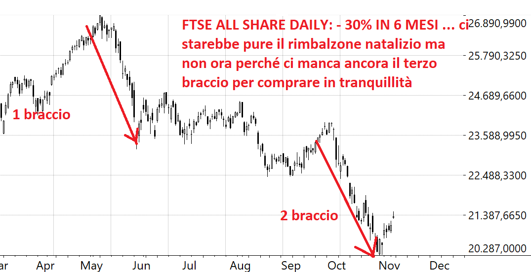 Guardando e riguardando il grafico del Ftse All Share mi viene da dire che questo ribasso è fatto da due grandi bracci ribassisti (indicati in figura) e noi siamo sopra l’area di accumulazione precedente all’interno di questo gigantesco e lunghissimo canale orizzontale.