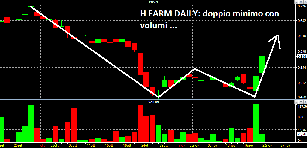 A livello di singoli titoli segnaliamo sempre l’accumulazione su CHL e sull’Aim interessante il doppio minimo disegnato oggi dal titolo H farm di cu i pubblichiamo il grafico che segue: