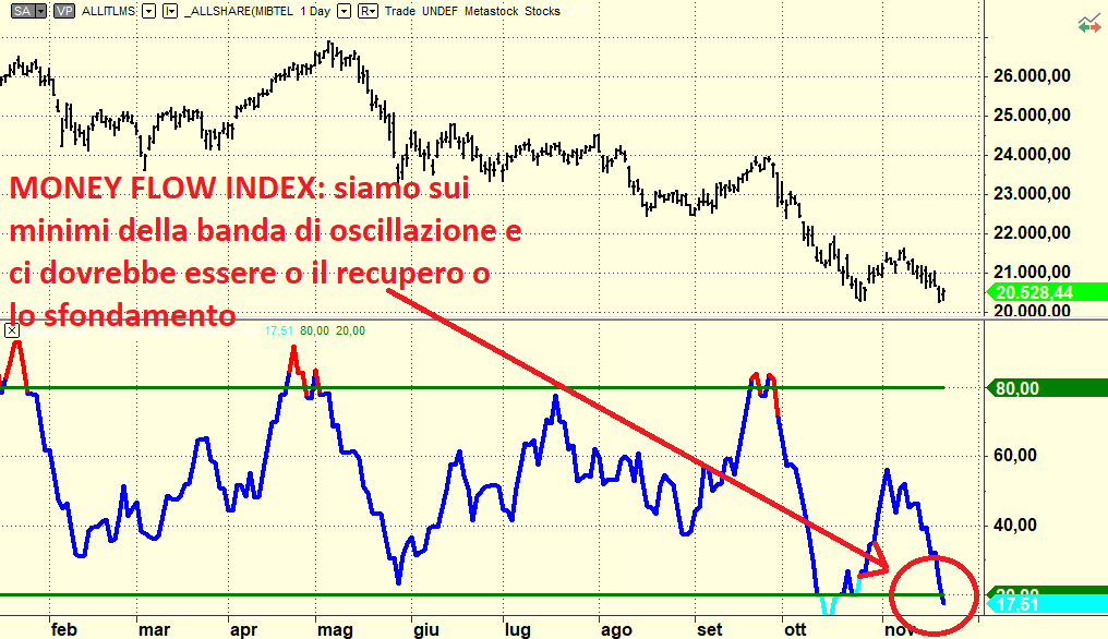 Sotto il profilo tecnico ci troviamo sull’orlo del burrone: se il mercato rompe 20.287 del Ftse All Share corriamo il rischio di prenderci in faccia un altro -10 o -20 % dai prezzi attuali. Poi i doppi minimi sono fatti proprio di situazioni come queste in cui il mercato improvvisamente inverte e crea una base da cui ripartire. Sul mercato continuo a vedere diverse situazioni di accumulazione e il Money Flow sull’indice Ftse All Share è nella fascia bassa di oscillazione pronto o al recupero o allo sfondamento al ribasso.