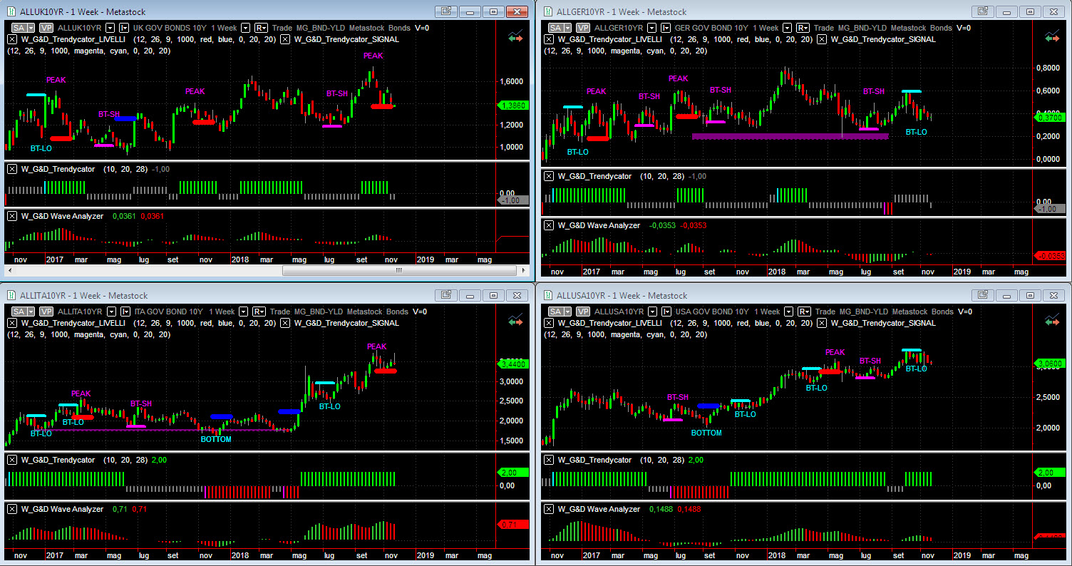 Osservando – a livello di analisi integrata – le curve dei rendimenti dei benchmark decennali dei principali mercati non presentano grandi variazioni a livello di impostazione di medio termine, salvo per l’area UK dove riscontriamo il cambiamento più significativo. Trendycator infatti passa in configurazione NEUTRAL sull’area UK, dopo la decisa contrazione dei rendimenti del GIlt ora verso are 1,30%; movimenti certamente condizionati dalle vicende Brexit e quindi da valutare se solo passeggere o stabili. Sull’area BUND Trendycator è sempre NEUTRAL con il decennale tedesco che punta verso area 0,30%. Sempre sui massimi relativi il rendimento del nostro Btp che riesce comunque a riportarsi poco sotto area 3,50% dopo aver rivisto i massimi a 3,70% di rendimento. Stabile l’area USA che si muove sempre in range tra area 3,00% e 3,20% di rendimento con Trendycator confermato in configurazione LONG.