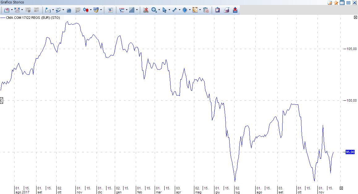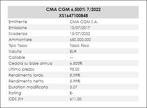 Il bond HY che analizziamo oggi è un tasso fisso della francese CMA CGM, compagnia di navigazione che si occupa di trasporto container, e della quale già ci siamo occupati in un precedente articolo quando abbiamo analizzato il bond CMA 7,75% 2021 (XS1244815111). Come già considerato in quell’occasione il settore di appartenenza e il business della società è piuttosto instabile p, determinando qundi un fattore di rischio che si aggiunge al Credit Risk proprio dell’emittente. Giusto per memoria di cronaca, CMA è di fatto la terza più grande compagnia di navigazione mercantile al mondo, forte di 170 rotte mercantili verso 400 porti in 150 nazioni, e ha realizzato nel 2018 un fatturato di 21 Mld USD. La società ha due sedi: una a Marsiglia e una in Virginia.