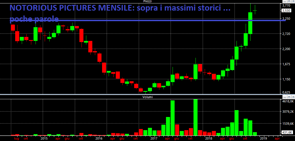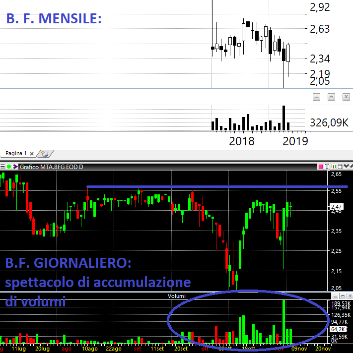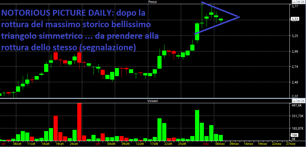 B.F: veramente interessante l'accumulazione di volumi che mostro nel grafico che segue. Si tratta di un titolo illiquido ma qui c'è qualcuno che sapientemente sta accumulando questo titolo. Da seguire con attenzione (segnalazione non buy ufficiale) eventualmente comprando sulla forza con ordine stop.