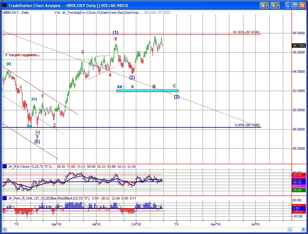 L’indice del Dollaro USA si è costantemente rafforzato da quando ha completato la battuta d’arresto a settembre, ed ora siamo a un puno critico. Mancando la prova che una cima è a posto, il dollaro dovrebbe continuare a rafforzarsi. A 103,11, l’onda 3 viaggerebbe alla stessa distanza dell’onda 1 un minimo probabile. In alternativa, se il dollaro supera i livelli vicini, la doppia sommità risultante consentirebbe una correzione più ampia dell’onda 2. Una rottura della trendline inferirore del canale, suggerirebbe che l’onda [c] è in corso a formare un flat. Quindi avremmo un cinque onde dispiegate verso il basso a testare e rompere di poco il minimi di 93,82 a completamento della correzione più grande. Gli stessi ragionamenti in direzione opposta si applicano all’Euro/Dollaro.