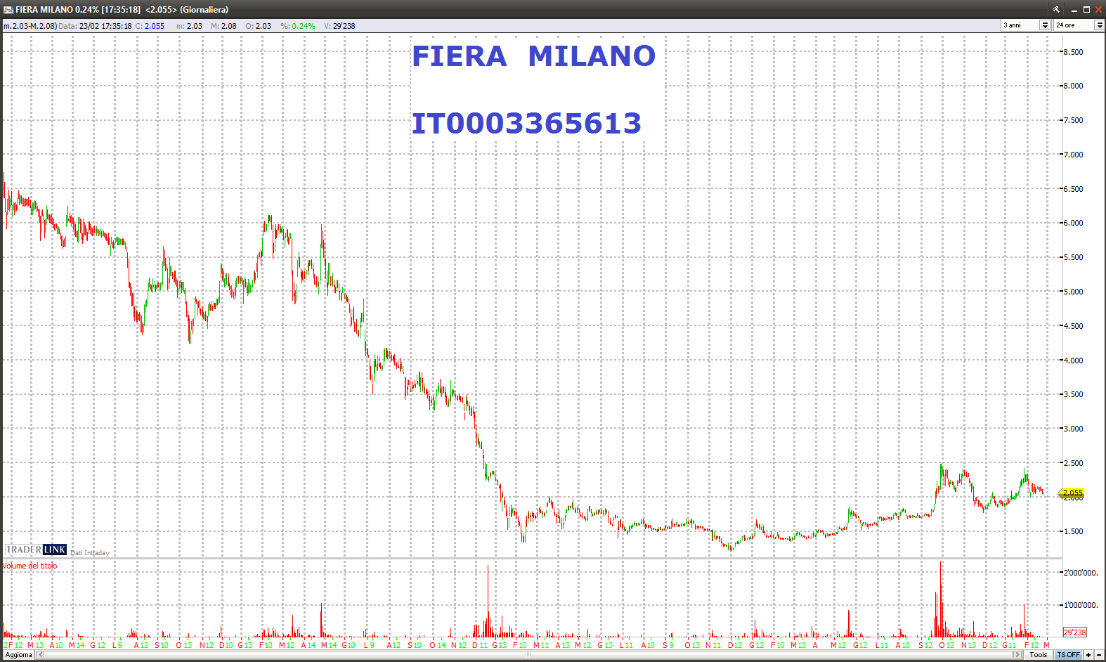 LE AZIONI IN BORSA. Come già accennato anche l’andamento del titolo Fiera Milano è stato impattato dalle vicende giudiziarie. La maggior parte dei gestori ha preferito abbandonare il titolo, già reduce due anni fa da un aumento di capitale, nonostante che le fiere proseguissero regolarmente con una notevole affluenza.