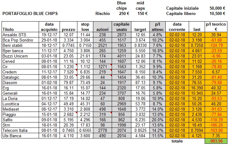 Portafoglio aggiornato alla chiusura di venerdì 2 febbraio 2018 (in settimana si è aggiunta la Banca Popolare di Sondrio al già ricco menu):