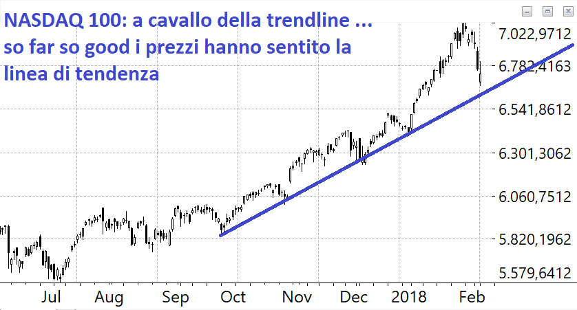 Alcune considerazioni sulla giornata odierna: nessun indice europeo o americano al momento ha rotto supporti importanti e se lo ha fatto viene dopo un trappolone in senso opposto nel movimento precedente (Dax). Aggiungo che il Nasdaq si sta adagiando sulla trendline di breve termine e lo sta facendo con una poderosa (al momento) barra rialzista. Che il mercato dovesse ritracciare lo sapevamo tutti, che la tendenza sia ancora al rialzo lo sappiamo anche questo tutti. Poi le cose cambiano di volta in volta e di giorno in giorno ma dobbiamo avere dei punti precisi bene in mente altrimenti rischiamo di decidere in base alle emozioni. In queste situazioni dobbiamo chiederci: dove cambieremo idea ? Cambieremo idea: