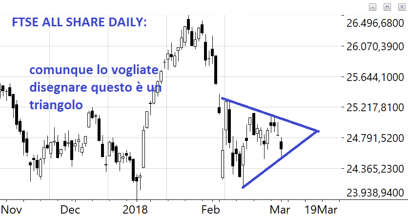 Un drittone al ribasso come quello che abbiamo vissuto nelle settimane scorse non finisce mai senza un po’ di congestione. La congestione serve al mercato per ri-orientarsi e alla smart money per comprare durante i ribassi. Così funziona la Borsa ! Quindi trovo che questi 3 giorni con segno negativo a Wall Street e il ritracciamento di oggi sul Ftse All Share siano il necessario corollario di una ripresa dei corsi azionari. Diciamo che quello che si sta delineando sugli indici USA e sul mercato italiano è il più classico dei triangoli. Seguono due immagini che parlano da sole.